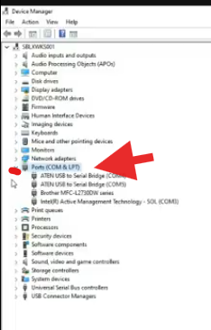 3. Once Device Manger is open go to PortCom & LTP and click the down arrow to expand. now shrink this screen. The below is telling us Com4 and 5 are in use.