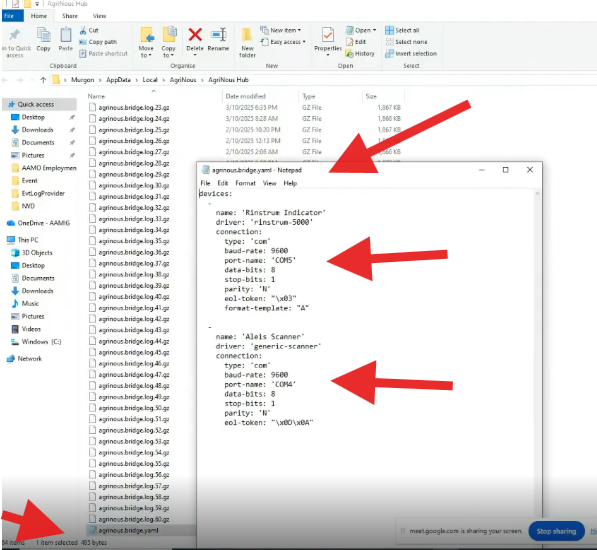 5. This will bring up a file with logs of the weighbridge. Scroll to the very bottom until you locate the Agrinous Bridge.YAML file.